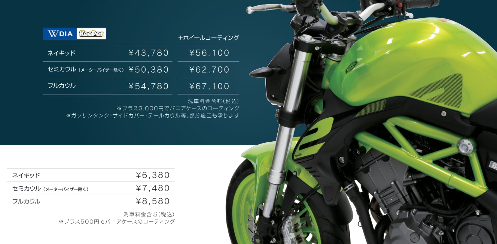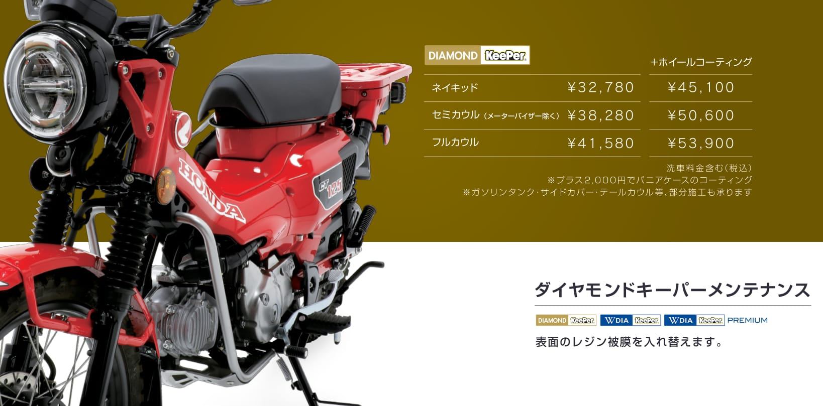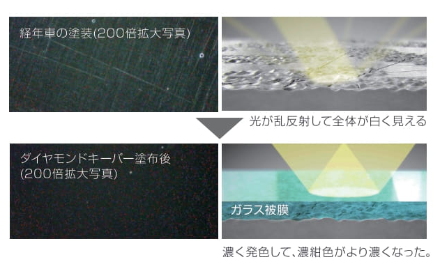 ダイヤモンドキーパーは厚みのある透明なガラス被膜とレジン被膜で凹 凸を埋めて塗装表面を平滑化するのと同時に、屈折率の違う異質の透明 ガラス被膜 被膜を2重に重ねることによって“独特の深い艶”を作り出します。
