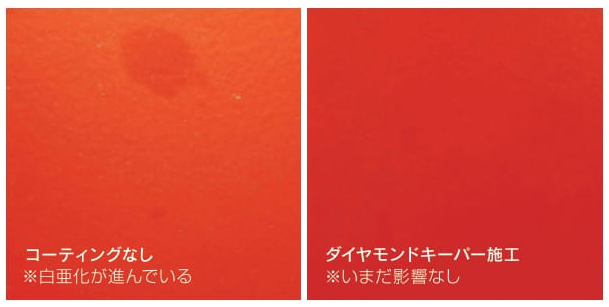 ダイヤモンドキーパーの厚いガラス被膜は紫外線を防ぎ日焼けを防ぎます。 また2重の厚い透明被膜が風雨の摩擦による色褪せや、ミネラルなどによる水シミを防止するため、露天駐車でも全く問題なく艶と輝きを保ちます。