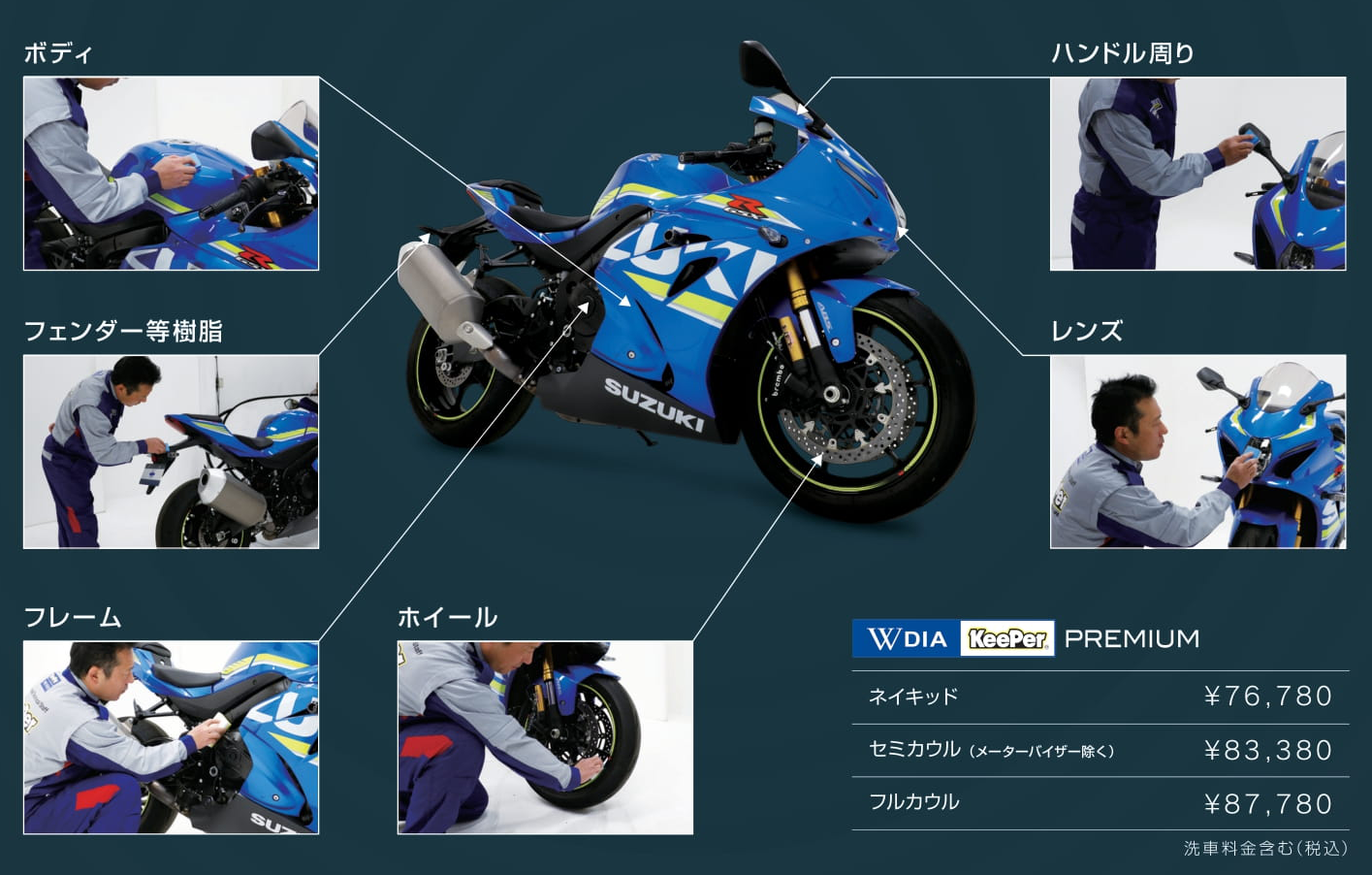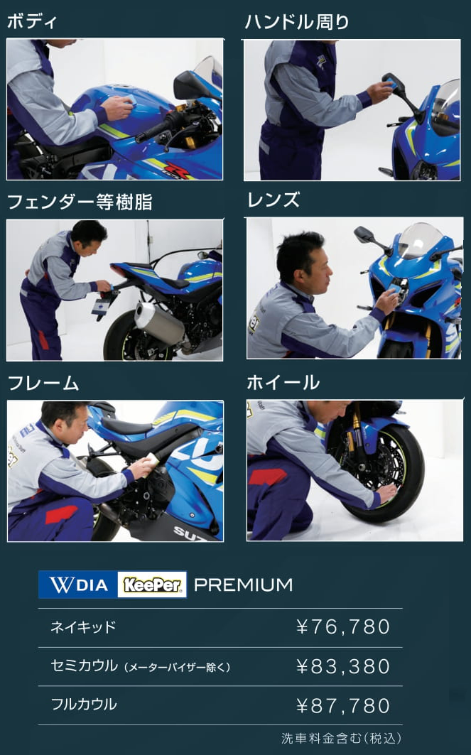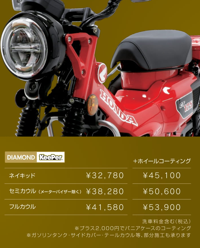 ダイヤモンドキーパーのはっ水力(水はじき)は、水だけでなくホコリなど の汚れも水もろともはじくので、普通に雨が降ると、逆に、バイクがキレイになってしまう不思議な現象があります。だから、気が付くと洗車をする回数がうんと減っています。これはダイヤモンドキーパーをご自分のバイクに施工されたユーザーの多くの方がおっしゃることです。